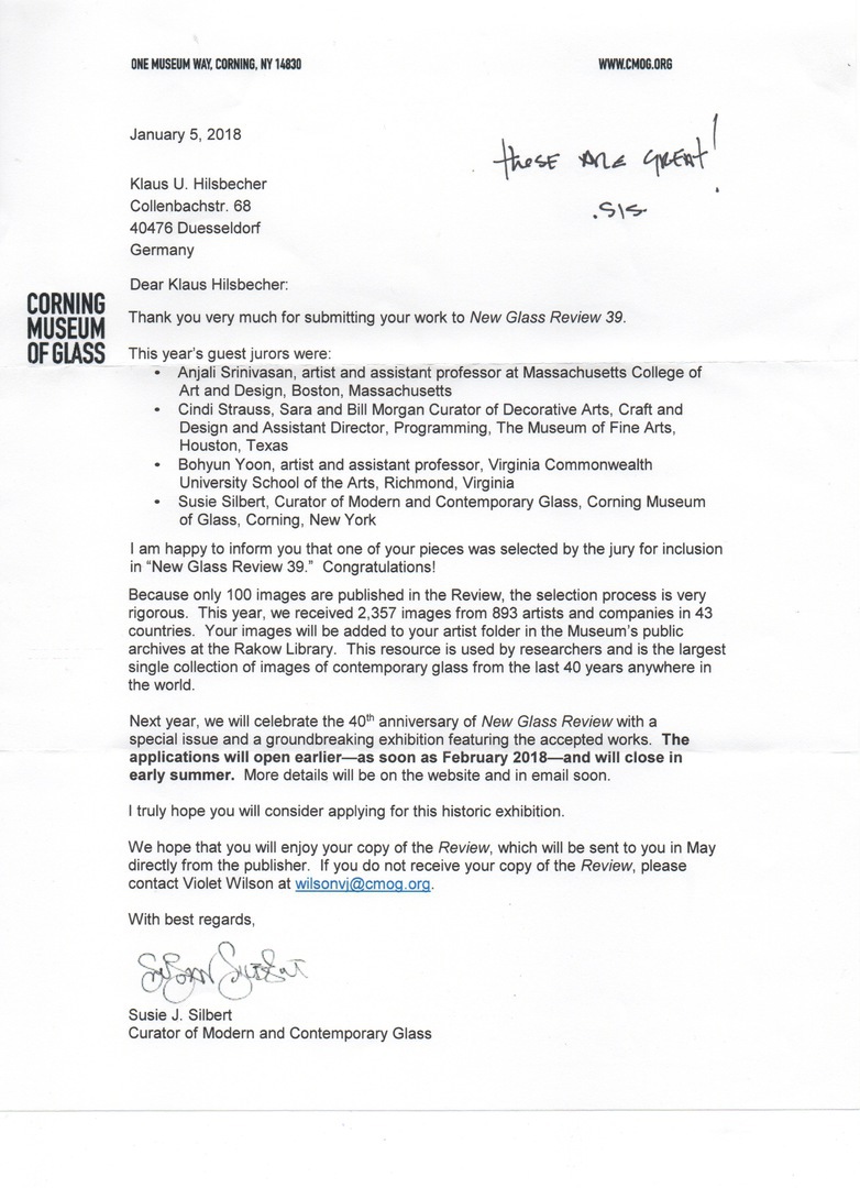 Heute kam das New Glass Rewiev aus Cornin New York, habe die Ehre, meine Plastik "LOOP" wurde ausgewählt.