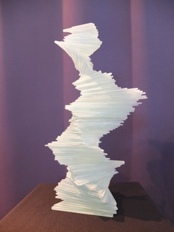 Hierbei wird die spiralförmige Metallstruktur zur Befestigung von Glasscheiben genutzt, die auf unterschiedliche Weise hergestellt und bearbeitet wurden.